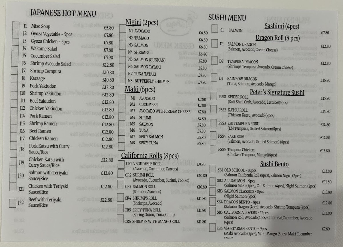 The menu offers a diverse selection of dishes representing Japanese, Chinese, Filipino, and Greek cuisines, reflecting a unique multi-cultural dining experience. It is organized into distinct categories to cater to various tastes and meal preferences throughout the day.